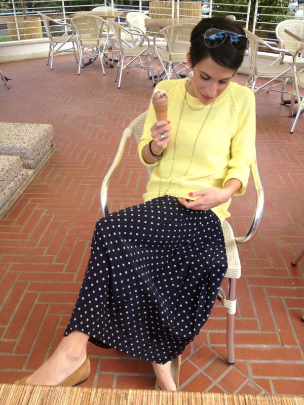 sabato pomeriggio, un gelato, un'ottima compagnia e tanto relax! questo è l'outfit che ho scelto: gonna lunga a pois, pull che dà un tocco di colore: il giallo per questa primavera è uno dei colori che preferisco! la gonna invece è una gonna decisamente vintage...era di mia madre quando aveva la mia età!!sono felicissima di averla ritrovata..che ne pensate?io credo che sia ampiamente portabile e del tutto alla moda! a me piace moltissimo!!! aspetto i vostri commenti e consigli!!!